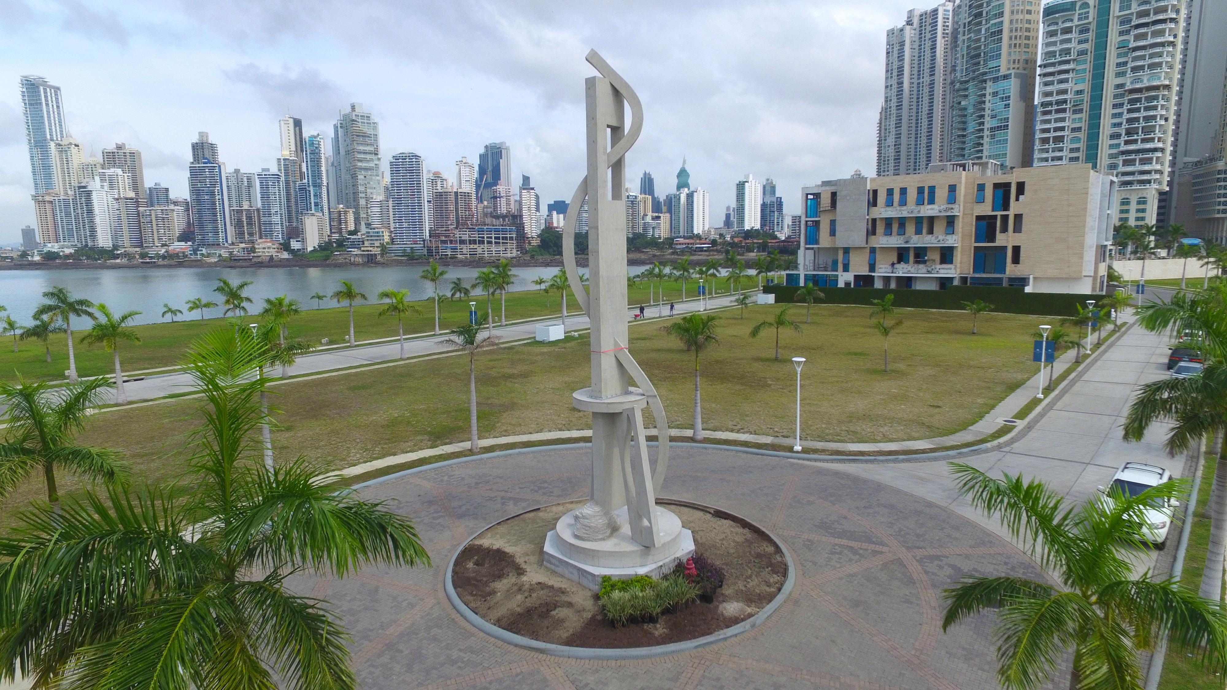 This sculpture is located on the man-made island of Punta Pacifica, just off the coast of Panama City. It contains elements that refer to the marine life in the immediate vicinity of the islands like the rock, the shell, the whale and the gulf